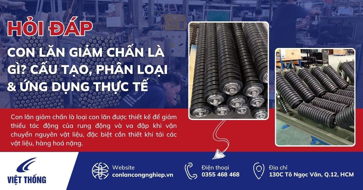 Con lăn giảm chấn là một loại thiết bị quan trọng trong các hệ thống băng tải công nghiệp, được thiết kế để giảm thiểu tác động của rung động và va đập khi vận chuyển nguyên vật liệu, đặc biệt cần thiết khi tải các vật liệu, hàng hoá nặng.